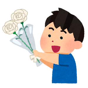 赤い薔薇、白い薔薇、黄色い薔薇の花束をプレゼントする息子のイラストです。