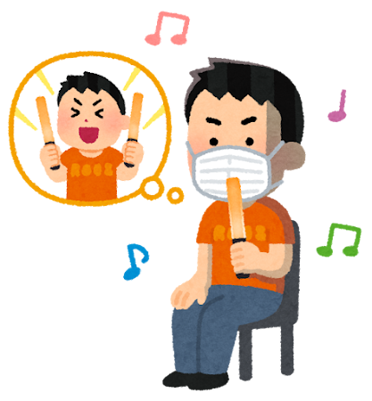 高まる気持ちを内に秘めながら座席に静かに座りペンライトを振るマスクを付けた男性のアイドルファン(オタク)のイラストです。